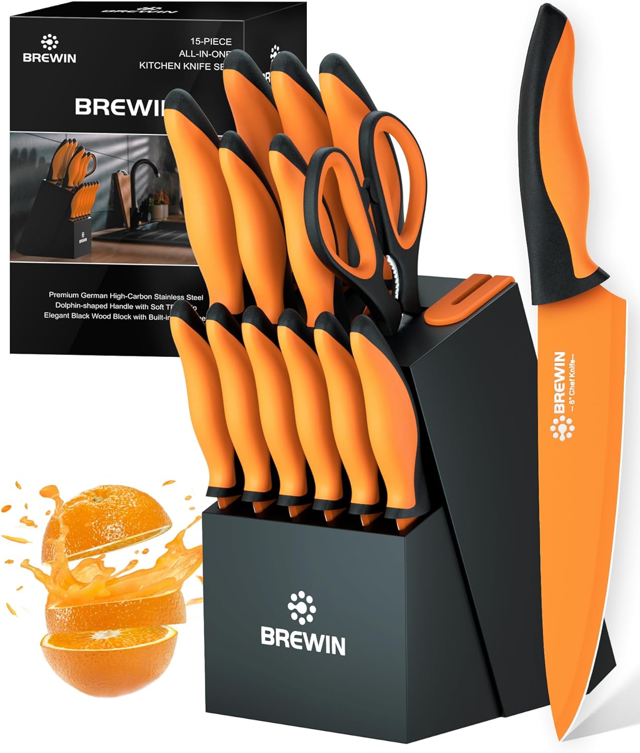 This professional-grade KD 15-piece kitchen knife set is a must-have for any serious chef. Crafted from German stainless steel. each knife is sharp and rust-resistant. with an ergonomic TPR anti-slip handle for a secure grip. Additionally. the included sharpener block makes it easy to keep your blades sharpened and ready.