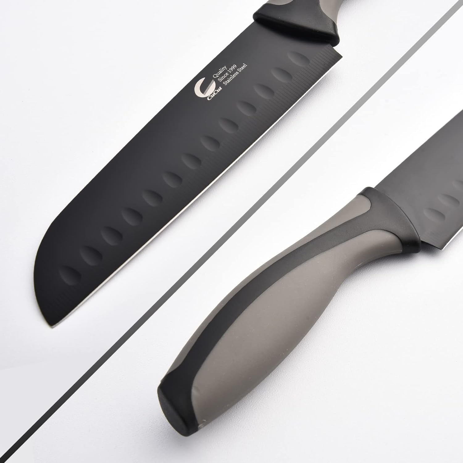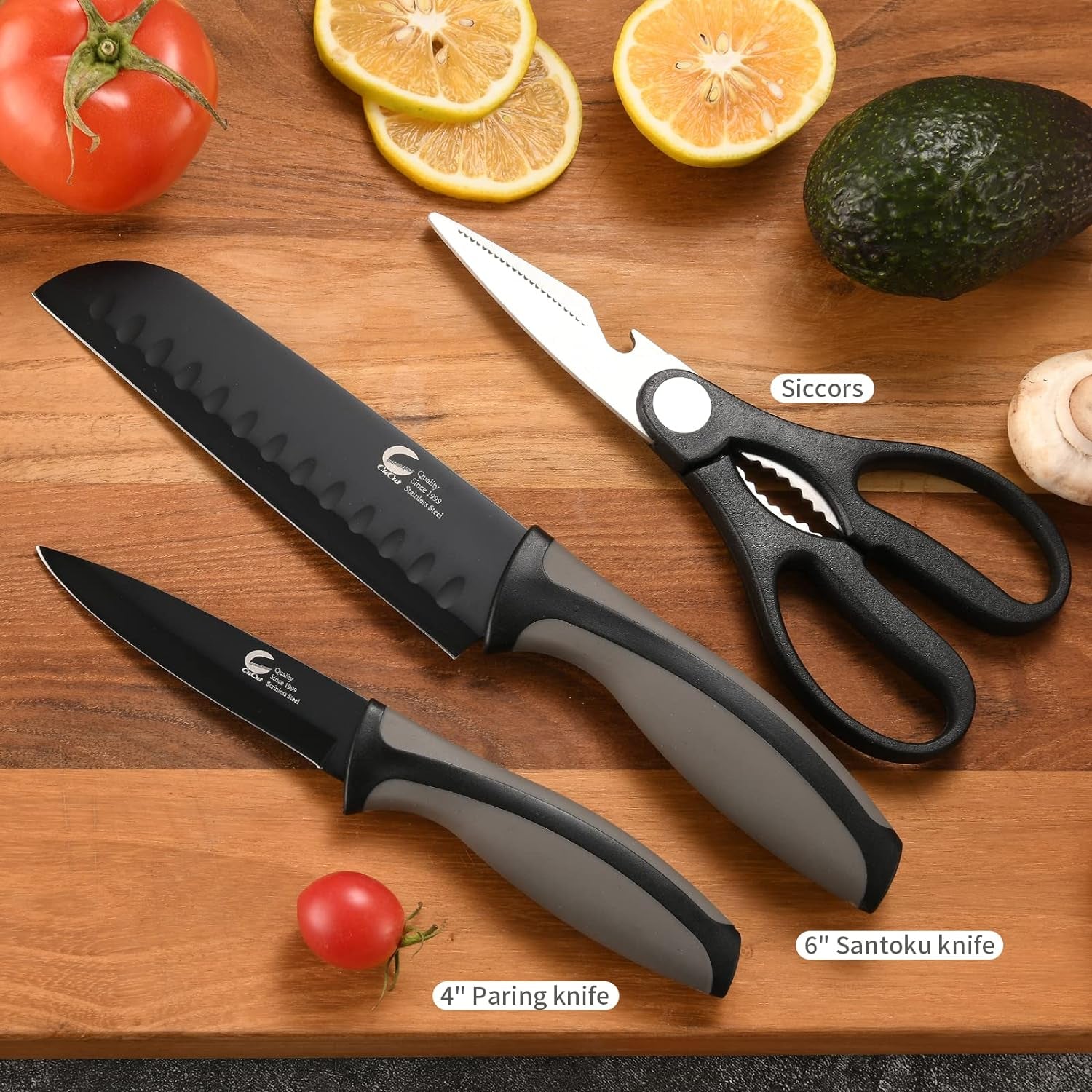 The KD Kitchen Knife Set features 10 ultra-sharp black stainless steel knives that are essential tools for any new home. With 2 cutting boards and safety sheaths included. this set is both practical and versatile. Dishwasher safe for easy cleaning. Upgrade your kitchen with this multifunctional set.