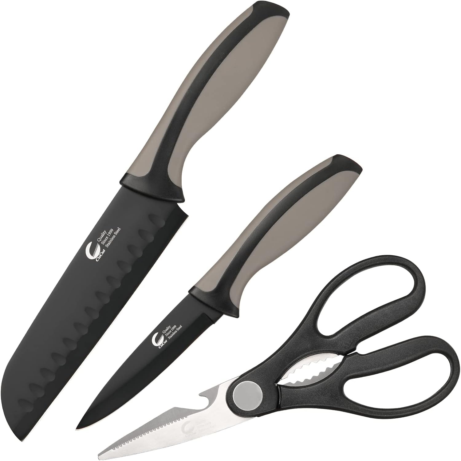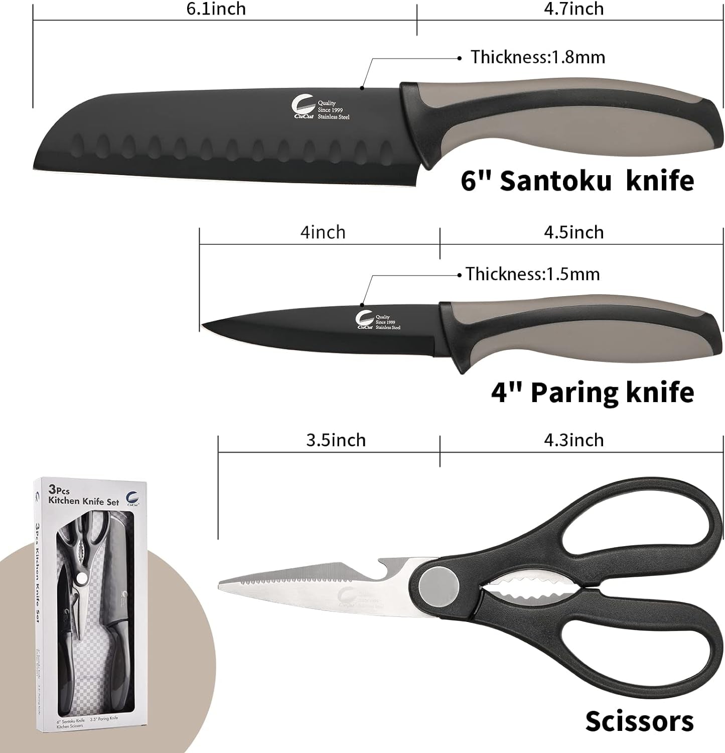 Enhance your culinary skills with the KD Kitchen Knife Set. This 3-piece set includes a versatile Santoku Knife. precise Paring Knife. and multifunctional Kitchen Scissors. Made with an anti-slip handle for safe and efficient use. Perfect for cutting. slicing. and dicing. and dishwasher safe for easy cleanup.
